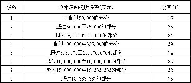公司所得税采取超额累进税率,对应纳税所得额在10万美元至33.5美元之间的,加征5%的附加税;应纳税所得额超过1500万美元的公司,要缴纳的附加税是超过1500万美元的应纳税所得的3%或10万美元的应纳税所得的3%,二者取较小者。主要从事提供服务的公司,只按35%的比例税率纳税。外国在美国从事贸易经营活动的所得,按照美国公司所得税的累进税率征税。