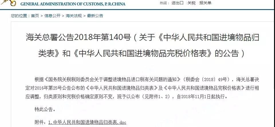 跨境电商注意了!中国海关11月1日起开始执行新税率! 海关总署公告2018年第140号(关于《中华人民共和国进境物品归类表》和 《中华人民共和国进境物品完税价格表》的公告) 根据《国务院关税税则委员会关于调整进境物品进口税有关问题的通知》(税委会〔2018〕49号),海关总署决定对2016年第25号公告公布的《中华人民共和国进境物品归类表》及《中华人民共和国进境物品完税价格表》进行相应调整,归类原则和完税价格确定原则不变,现予以公布(见附件1、2),自2018年11月1日起执行。 特此公告。 附件:1.中华人民共和国进境物品归类表.doc 2.中华人民共和国进境物品完税价格表.doc 海关总署 2018年10月25日 根据公告,新归类表包含27个物品类别,依次列明税号、范围和税率。 内容来源:海关总署